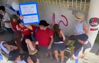 צפו בבושה: מפגינה נעצרה לאחר שריססה גרפיטי מול בית הדין הרבני