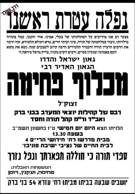 הלוויתו תצא בשעה 13.30 מישיבתו מוסדות תורה וחסד ברחוב חידושי הרים, לבית החיים של נציבי ישיבת פוניבז בבני ברק.