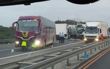 חמישה פצועים, בהם שניים קשה, בתאונת שרשרת בין 3 משאיות ואוטובוס סמוך לבית ינאי