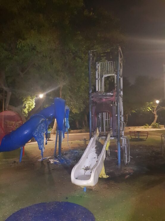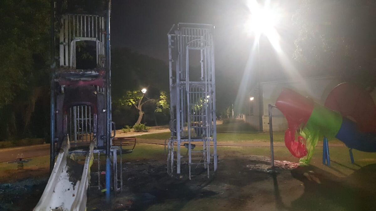 המשטרה פתחה בחקירה אמשר בעקבות הצתה והשחתת מתקני שעשועים בגינה ציבורית סמוך לבית כנסת ברחוב הרש"ש בראש העין.