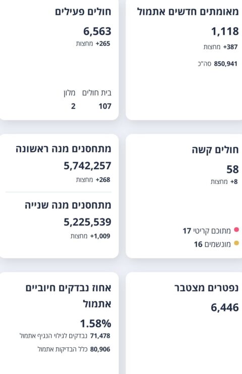 משרד הבריאות מעדכן על 1,118 מאומתים חדשים אתמול (16.7), מתוך 71,478 נבדקים לגילוי הנגיף אתמול – 1.58% מהנבדקים חיוביים.