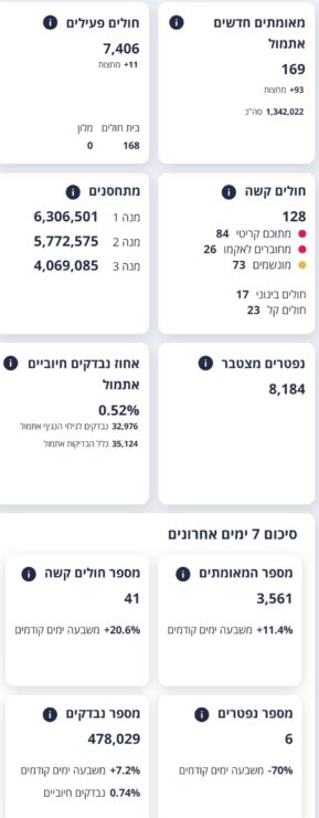 משרד הבריאות מעדכן על 169 מאומתים חדשים אתמול (27.11), מתוך 32,976 נבדקים לגילוי הנגיף.