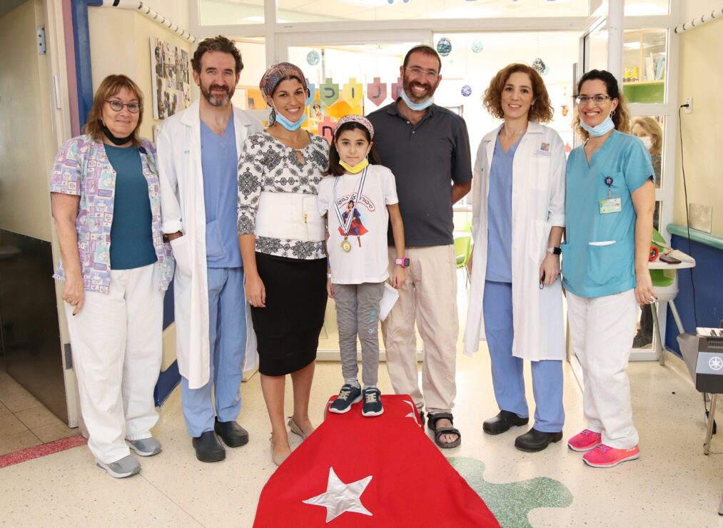 תמונה מטקס שחרורה המרגש אתמול של בת ציון. בתמונה מימין לשמאל: מאיה פרנקל, סגנית מנהלת הסיעוד במחלקת ילדים ג', ד"ר אורית וייסבורד- צינמן, רופאה בכירה במכון לגסטרואנטרולוגיה, תזונה ומחלות כבד, בת ציון והוריה, ד"ר מיכאל גורביץ, מנהל יחידת השתלות כבד שניתח את בת ציון, ורחלי גבע, מנהלת הסיעוד במחלקת ילדים ג'