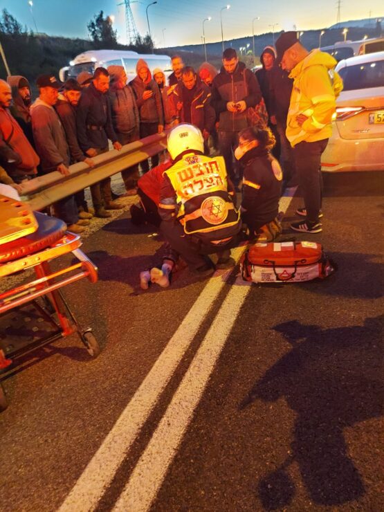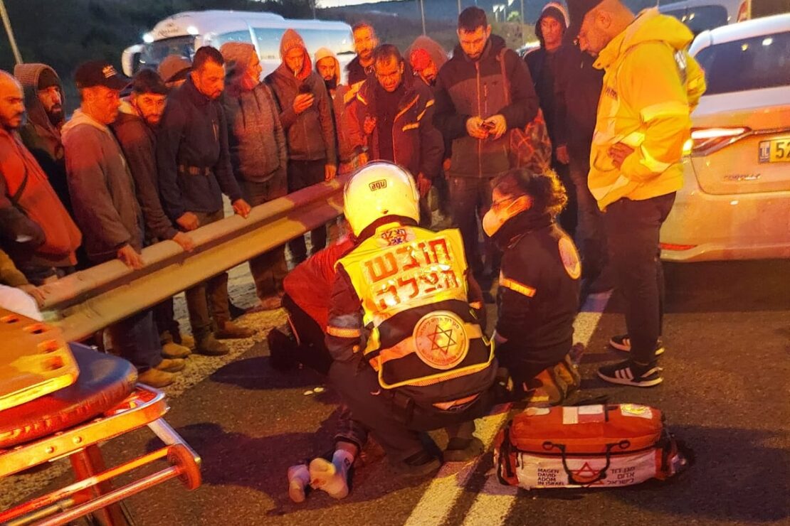 במד"א מעדכנים כי הבוקר בשעה 06:02 התקבל דיווח על הולך רגל פלשתינאי שנפגע מרכב בכביש 443 סמוך למחסום מכבים. חובשים ופראמדיקים של מד"א העניקו במקום טיפול רפואי וביצעו פעולות החייאה שבסופן נקבע מותו של גבר כבן 25. נהג הרכב פונה במצב קל לבי"ח שמיר-אסף הרופא.