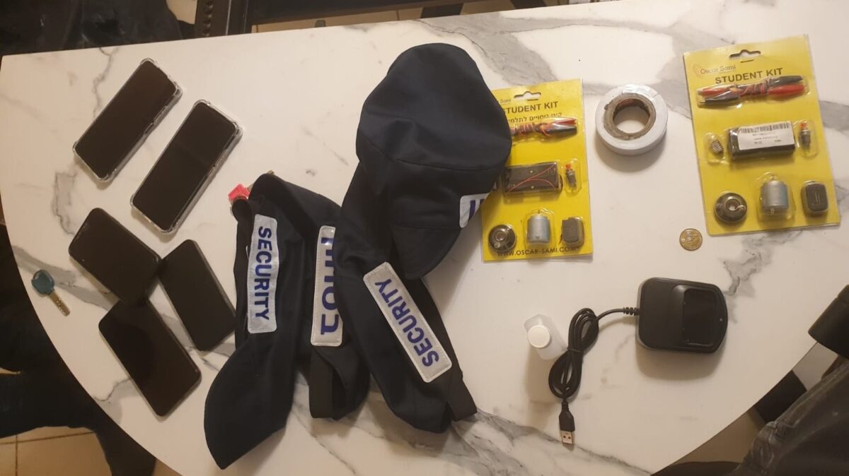 בתוך הדירה איתרו השוטרים כובעי זיהוי עם הכיתוב 'בטחון', טלפונים ניידים ורכיבים אלקטרוניים שעפ"י החשד היו אמורים לשמש להרכבת מטעני חבלה.