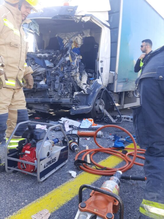 צוותי הכיבוי השתמשו בציוד הידראולי כדי לחלץ את הלכוד מהמשאית.