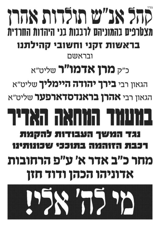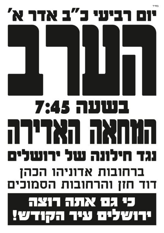 הערב התקיימה באישור המשטרה, עצרת תפילה וזעקה של העדה החרדית בראשות הגאב"ד, נגד עבודות הרכבת הקלה באזורים החרדים בירושלים.