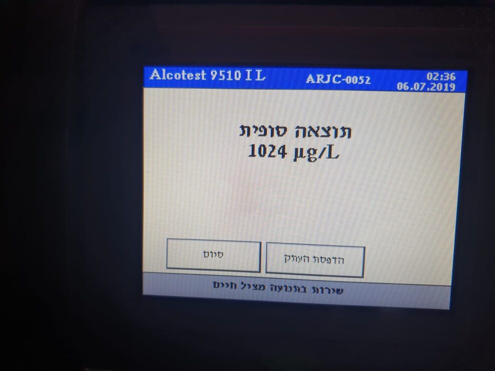 כאמור בוצעה בדיקת שכרות באמצעות מכשיר הינשוף לנהג בן ה-34 תושב ראשל"צ ונמצאה כמות של 1024 מ"ג לליטר אוויר נשוף (מעל לפי 4 מהכמות המותרת).
