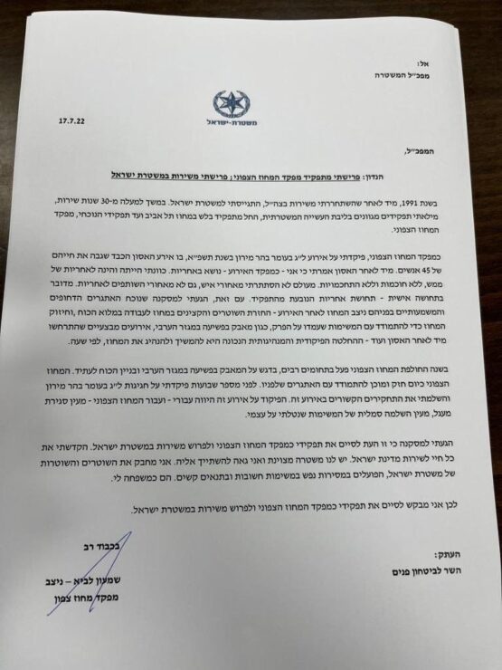 אני קורא למפכ"ל המשטרה לאמץ את הצעד של לביא ולהגיש את פרישתו עוד היום.