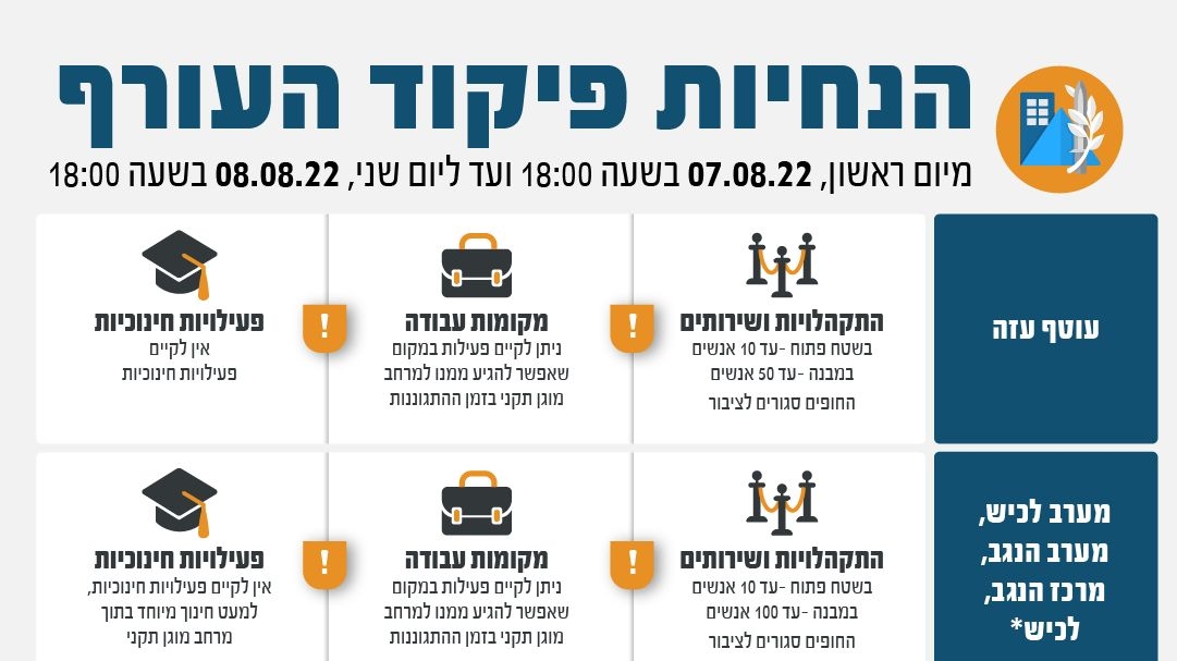 בהמשך להנחיות פיקוד העורף שהופצו אתמול, מצורפות ההנחיות העדכניות אשר נכנסות לתוקף החל מהיום (א׳), 7.8.22 בשעה 18:00 ועד מחר (ב׳), 8.8.22, בשעה 18:00: