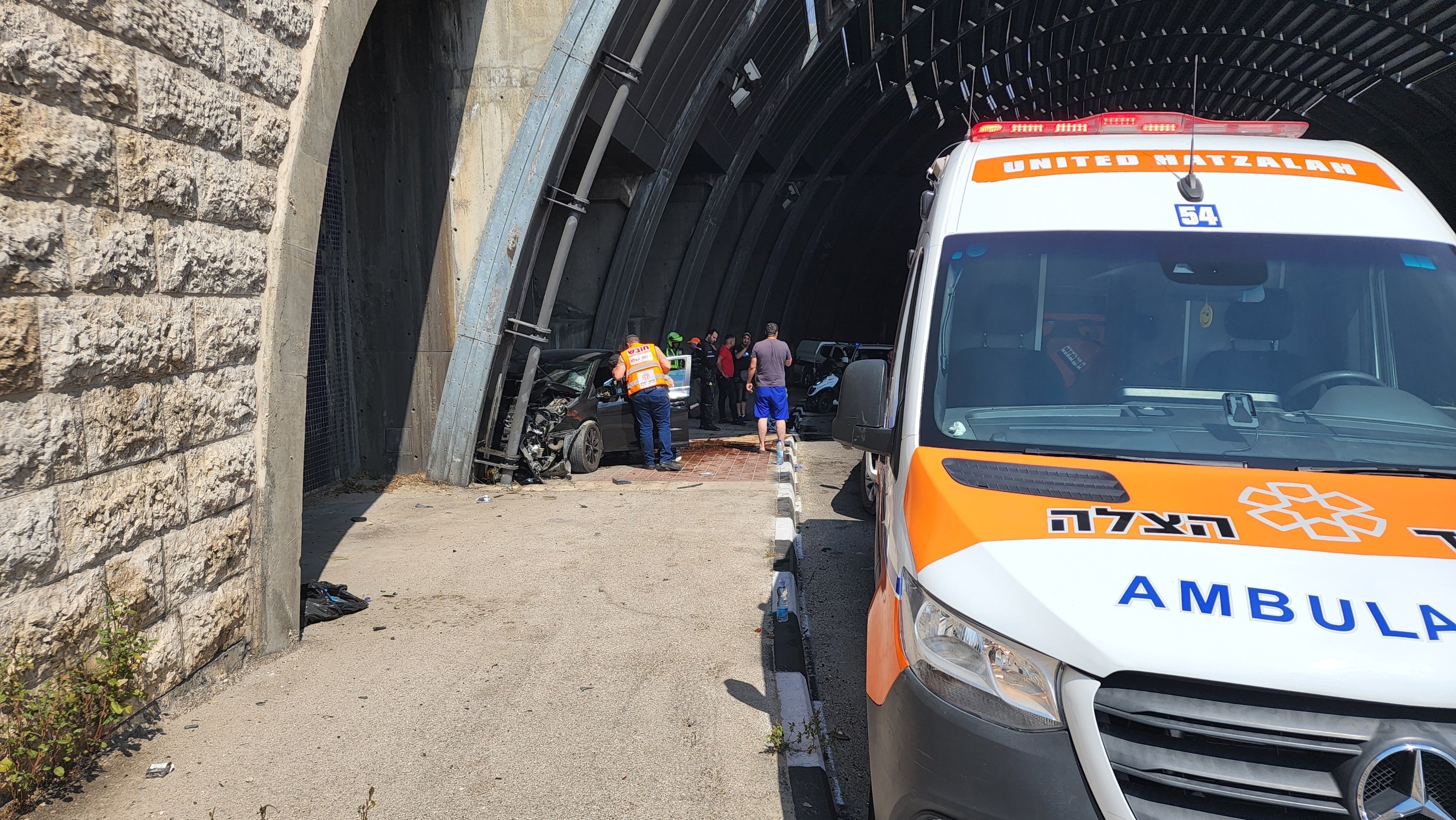בשעה 14:38 התקבל דיווח על רכב שהתנגש בקיר ברחוב יצחק הנדיב בירושלים סמוך ליציאה ממנהרת נעמי שמר. חובשים ופראמדיקים של מד"א ואיחוד הצלה העניקו טיפול רפואי ופינו לבי"ח הדסה הר הצופים, תושב מזרח ירושלים כבן 60, במצב קשה עם פגיעה רב מערכתית.