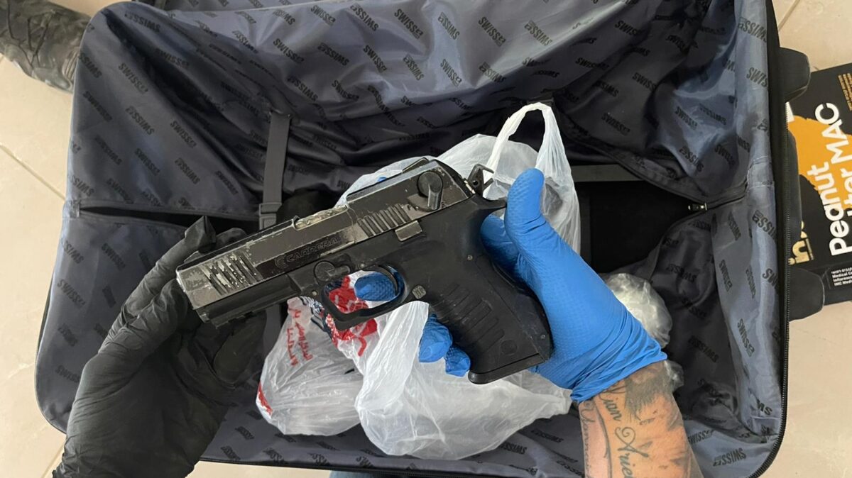 במהלך החיפוש איתרו השוטרים אקדח, מחסנית ותחמושת וחומר החשוד כסם מסוג חשיש ושתלי קנביס שהיו.