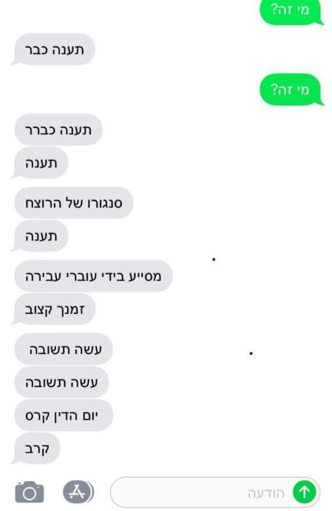 עורך הדין קיבל אתמול בלילה מספר שיחות למכשיר שלו ממספר שלא זיהה, וכאשר שאל במסרון לזהותו של המתקשר נענה, על פי החשד, במסרונים הבאים: