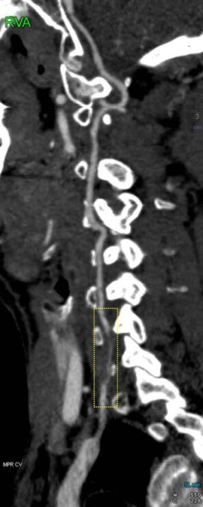 בן 33 מירושלים הגיע למיון בשערי צדק לאחר שסבל מסחרחורות וחולשה בידו הימנית. בדיקת סי טי אנגיו ראש-צוואר שבוצעה באופן מידי חשפה אוטם קטן בחלקו השמאלי של המוחון וקרע בעורק הימני הורטבראלי שמוביל דם לגזע המוח, שזוהו על ידי הרדיולוג התורן, ד"ר סלבה ויאצ'סלב. בשל חוסר התאמה של הממצאים במוחון לממצאים בצוואר בוצעה בדיקת MRI שהדגימה קרע דו צדדי בצרבלום.