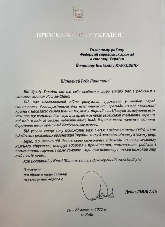 לפני החג, התקשר ראש ממשלת אוקראינה דניס שמיהל ששהה באותה עת בועידת האו"ם בניו יורק לרב מרקוביץ על מנת לאחל לו ולכל יהודי אוקראינה שנה טובה ושמחה. בהמשך הוא אף שלח מכתב ברכה רשמי, בו ציין את ההקרבה והשותפות של יהודי אוקראינה במאמץ המלחמתי.