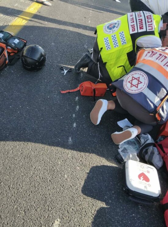שמואל אריאלי ואברומי שפריי, מתנדבי 'צוות הצלה' מוסיפים: כשהגענו למקום הבחנו ברוכב אופנוע גבר כבן 25 ששכב על הכביש עם חבלה רב מערכתית במצב קשה, לאחר שנפגע בתאונת דרכים עם כלי רכב פרטיים, בסיוע חובשים ופארמדיקים נוספים של מד"א הענקנו לו סיוע רפואי ראשוני הכולל עצירת דימומים, קיבועים וחבישות. והוא מפונה ע״י צוות אט"ן של מד"א כשהוא מורדם ומונשם במצב קשה עם חבלה רב מערכתית לחדר טראומה בביה"ח הדסה עין כרם בירושלים.