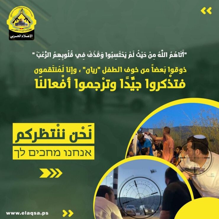 בכרוז שהופץ, שפורסם בין היתר בקבוצת התקשורת של ארגון פתח בשכם, נכתב בין היתר בשפה הערבית "אלוהים בא אליהם משם לא ציפו והטיל אימה בליבם. תטעמו קצת מהפחד של הילד ריאן ואנחנו ננקום, אז זכרו היטב ותערבו את מעשינו". כמו כן הוספה שורה בשפה העברית בה נכתב "אנחנו מחכים לך" לצד אותם המילים בערבית.