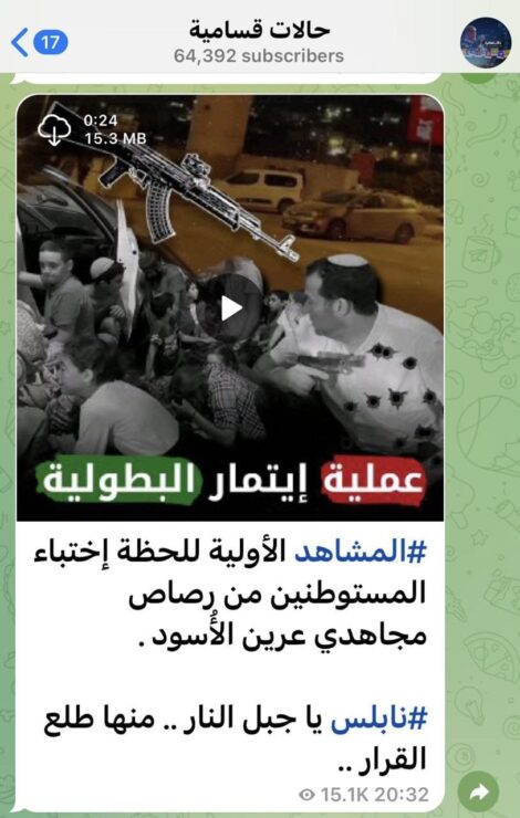 אתמול פרסם ערוץ הטלגרם של החמאס קבוצת קסאמיה, סרטון מפיגוע הירי בסיום ההפגנה בככר החטיבה, בו נראה ראש מועצת שומרון אוחז בנשק ומגן על ילדים מירי לעברם. ברקע הסרטון נשמע שיר הקורא לרצח יהודים ובסופו מכוון רובה לראשו של ראש מועצת שומרון.