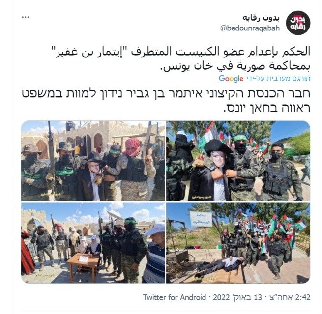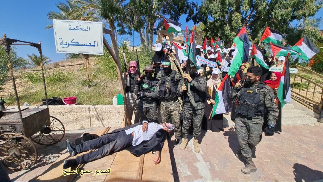 בחאן יונס ברצועת עזה נערך היום מיצג ראווה של ארגון הטרור חמאס, בו נראית דמותו של ח"כ איתמר בן גביר, שכביכול מועמד לדין ומוצא להורג במשפט ראווה.