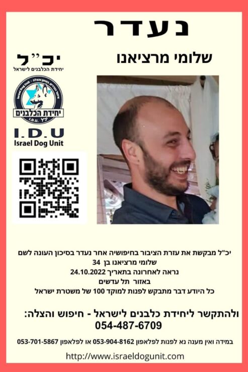 בתום חיפושים נרחבים על ידי יחידת הכלבנים לישראל, תוך הפעלת מיטב האמצעים, ביחד עם כוחות נוספים, אחר הנעדר שלומי מרציאנו שנעלמו עקבותיו בתאריך 23.10.2022 – אותר לצערנו כשהוא ללא רוח חיים.