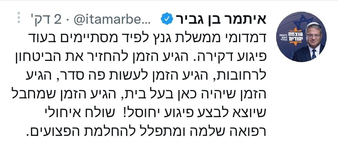 יו"ר מפלגת עוצמה יהודית, חבר הכנסת איתמר בן גביר אמר: "דמדומי ממשלת גנץ לפיד מסתיימים בעוד פיגוע דקירה. הגיע הזמן להחזיר את הביטחון לרחובות, הגיע הזמן לעשות פה סדר, הגיע הזמן שיהיה כאן בעל בית, הגיע הזמן שמחבל שיוצא לבצע פיגוע יחוסל! שולח איחולי רפואה שלמה ומתפלל להחלמת הפצועים."