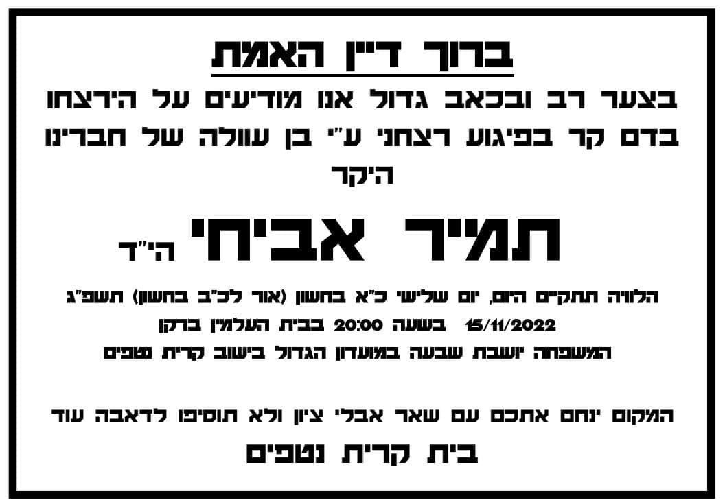 מהישוב קריית נטפים נמסר: "אנו המומים וכואבים לבשר על לכתו של חברנו, תושב הישוב, תמיר אביחי הי"ד. תמיר נרצח בידי מחבל מתועב בכביש 5, אנחנו שולחים חיבוק חם והרבה כוחות למשפחתו וילדיו. קהילת קרית נטפים תעשה כל שביכולתה לסייע למשפחה".