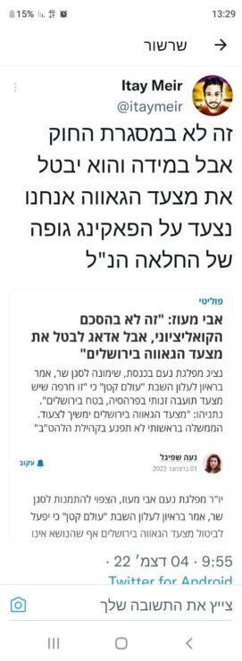 בתלונה נכתב: "מזה מספר ימים ישנה אוירת הסתה ואיומים כנגד ח"כ אבי מעוז, יו"ר מפלגת נעם. בתוך האוירה העכורה, איתי מאיר מצא לנכון להסית לרצוח את ח"כ מעוז, ולכנותו נאצי. מאיר פרסם פוסט ברשת הטוויטר בה כתב: "זה לא במסגרת החוק אבל במידה והוא יבטל את מצעד הגאווה אנחנו נצעד על הפאקינג גופה של החלאה הנ"ל", תוך שהוא מצרף לדבריו כתבה המתחייסת לח"כ אבי מעוז. בפוסט נוסף כתב מאיר: "נו אני מחכה כבר דקה אף אחד לא קרא לי אלים כי אני תומך במאבק אלים בנאצים", תוך שהוא מתייחס לדבריו הקודמים, ובמשתמע מכנה את ח"כ מעוז נאצי.