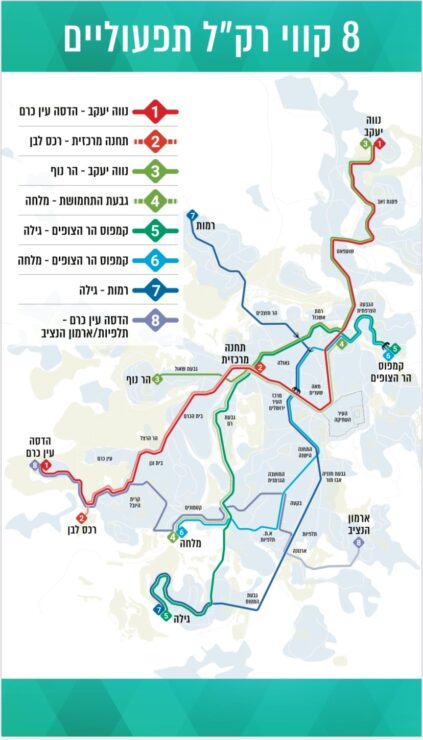 ירושלים היא העיר הראשונה והיחידה עד כה בישראל עם קו רכבת קלה פעיל, שאורכו כ-14 קילומטרים, הוא כולל 23 תחנות ומסיע כ-170 אלף נוסעים ביום. בחודשים הקרובים הקו יוארך דרומה עד למרכז הרפואי הדסה עין כרם בדרום, וצפונה עד לקצה שכונת נווה יעקב. הקו יוארך ב-7.7 קילומטרים ויתווספו לו 12 תחנות חדשות. פתיחת המקטעים החדשים צפויה להגדיל את מספר הנוסעים בכ-15,000 ליום.