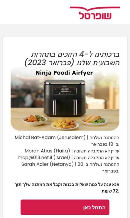 בימים האחרונים מועבר קישור המזמין להיכנס לאתר המתחזה לאתר שופרסל הרשמי ובמסגרתו ניתן כביכול לזכות במוצרים למטבח.