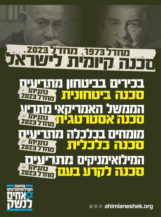 הקמפיין החדש של המילואמיניקים: משווה בין הסכנה הקיומית שנשקפה לישראל במחדל יום הכיפורים 1973 לפני 50 שנים, תחת כהונתה של ראש הממשלה גולדה מאיר לבין המחדל והסכנה הקיומית הנשקפת למדינה כיום תחת ראש הממשלה בנימין נתניהו.