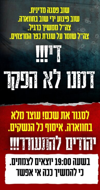 "יהודים להתעורר, דמינו לא הפקר", נכתב במודעה, שקראה לתושבים לצאת ולהפגין בצמתים החל מהשעה 19:00 בערב.