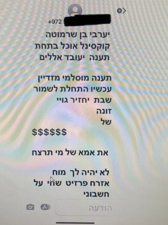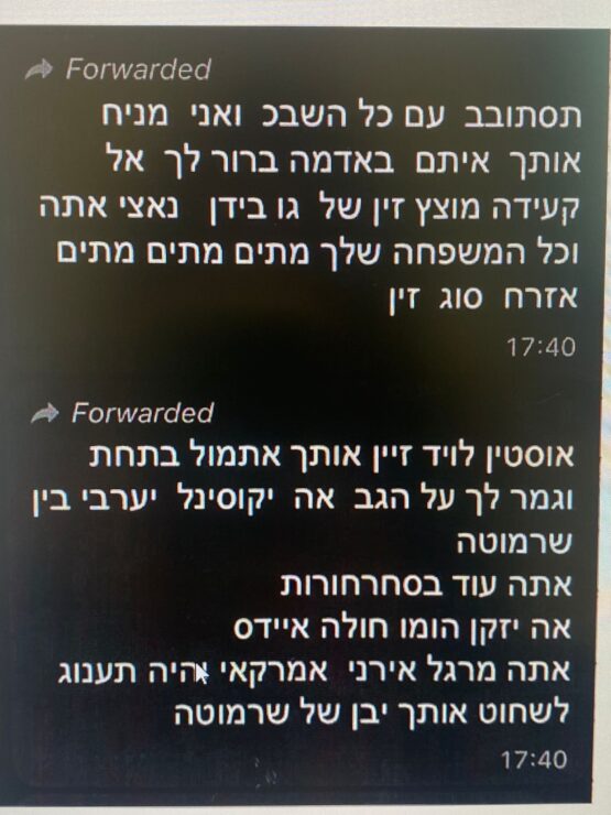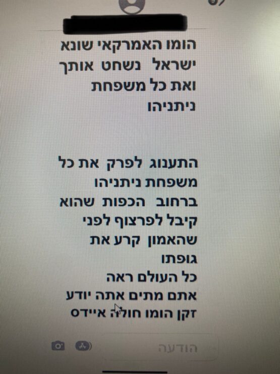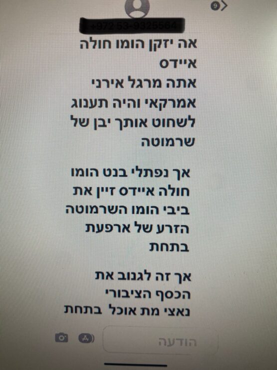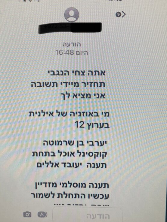 עם התפתחות החקירה, מצאו החוקרים כי החשוד לא הסתפק רק בריסוס כתובות ברחבי העיר, אלא הגדיל לעשות ושלח הודעות מאיימות למכשירו הנייד והאישי של לא פחות ולא יותר מראש המטה לביטחון לאומי והיועץ לביטחון הלאומי של רוה"מ, מר צחי הנגבי.