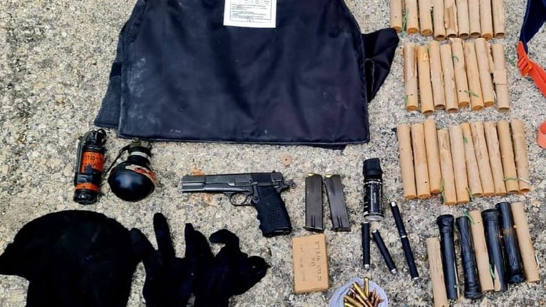 בתיק שהיה ברשותו של החשוד השני נמצאו ע״י כוחות המשטרה ומג״ב תיק עם פרטי אמל״ח שונים, בהם: תחמושת לאקדח ול-M-16, שני רימוני הלם, זיקוקים, כפפות ורעלה.