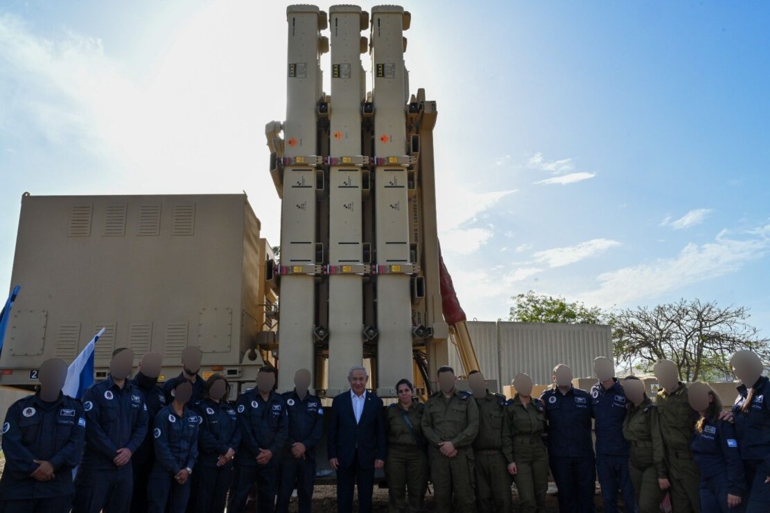 מאחוריי מערך 'קלע דוד' עם המפקדים והמפקדות. המערכת הזאת יירטה בהצלחה רקטה מעל גוש דן. אנחנו נמשיך לפעול בהגנה ובהתקפה עד לסיום המערכה.