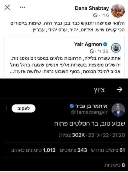 השר בן גביר: "איומים לא מפחידים אותי, אמשיך לפעול למען ביטחון אזרחי ישראל. מודה ליחידת מגן וגורמי הביטחון אשר שומרים עליי ומשפחתי".