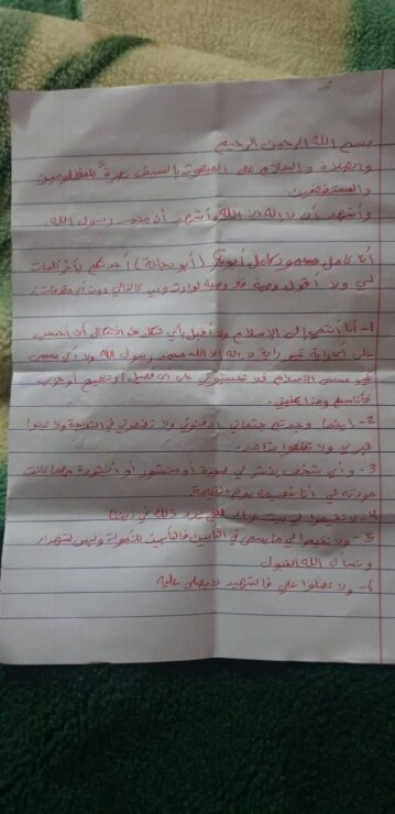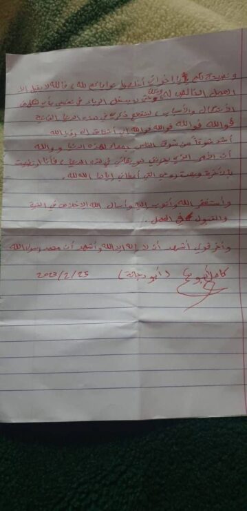 בצוואה שנמצאה בתיקו נכתב: "אל תקימו עבורי בית אבלים ואל תתפללו על גופתי כי על שהיד לא מתפללים. כל אדם שמפרסם תמונה או פסוק דתי (המשייך אותו לארגון) – אני אהיה אויבו ביום הדין".