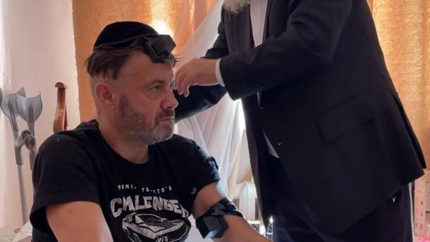 רוסלן, חייל יהודי מקייב נלחם בחירוף נפש אך כמעט איבד את חייו בשדה המוקשים בחבל דונבאס ● בבית החולים הוא זכה להניח תפילין עם רבה הראשי של קייב הרב יונתן מרקוביץ ולברך ברכת הגומל על החיים שקיבל במתנה.