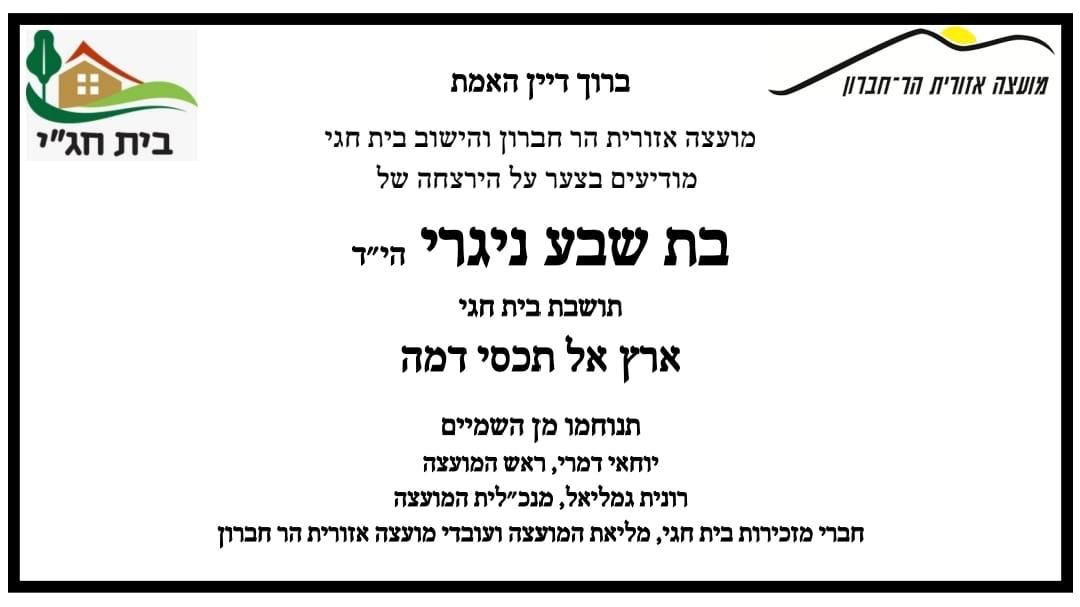 מועצה מוקמית אפרת מרכינה ראש על הרצחה של בת שבע נגרי הי"ד לבית משפחת רביד מאפרת.