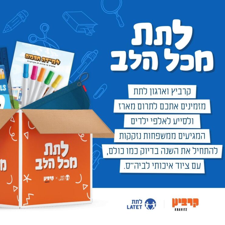 רשת חנויות קרביץ וארגון לתת יקיימו עד ה-1.9 מבצע התרמה משותף – "לתת תיק", העוסק בחלוקת ציוד בסיסי לשנת הלימודים. בזכות המבצע יקבלו כ-5,000 ילדים ממשפחות הנתמכות על ידי הארגון, תיקי גב, קלמרים, מחברות וכלי כתיבה. זו השנה השלישית של המיזם שחשיבותו הולכת וגדלה לאור העלייה באינפלציה ויוקר המחייה, והשנה השלישית בה רשת חנויות קרביץ נרתמת למאמץ הסיוע למשפחות החיות במצוקה כלכלית לאפשר לילדיהן לפתוח את שנת הלימודים עם ציוד לימודי בסיסי.