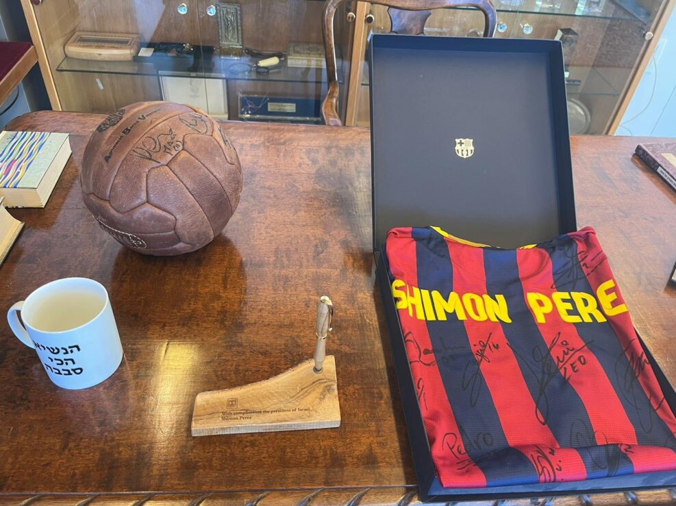 זוהי אינה הפעם הראשונה ששחקני הקבוצה מתחברים לפרס ועשייתו, שכן בשנת 2005 הגיע הנשיא לשעבר למשחק השלום בברצלונה, בו שיחקה נבחרת ישראלית- פלסטינית מול נבחרת בארסה תחת מסר של אחווה ואחדות. אותו הכדור מהמשחק הידוע הוענק היום במהלך הביקור לחברי הנבחרת, לזכרו של פרס ז"ל.