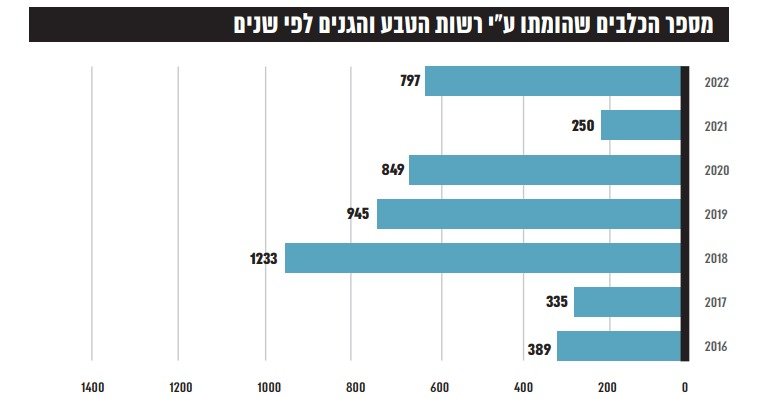 נתונים שנמסרו לעמותת 'תנו לחיות לחיות' מלמדים בשנת 2022 זינק המספר בחזרה ביותר מ,250%- ל797- כלבים. פילוח הנתונים מראה שרובם המוחלט של הכלבים הללו (699 כלבים) נורו בשטחי הגדה המערבית. פנייתנו בנושא לרשות הטבע והגנים נענתה בנימוק שלפיו בשטחי יהודה ושומרון לא חלה המגבלה על תחומי הירי בשטחים הפתוחים בשל אי תחולת החוק הישראלי; וכן מ"היקף התופעה העצום של כלבים משוטטים ומתפראים שם.
