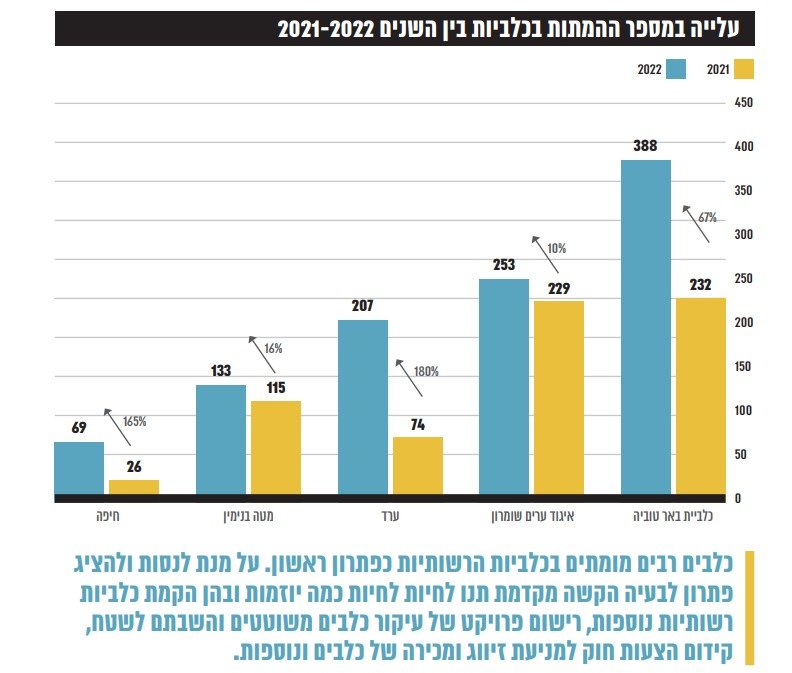 החל מ-2017 ועד 2021, מתוך כל הרשויות שעשו שימוש ברעל תוך המתה של אלפי כלבים, או שקיבלו היתר ולא עשו בו שימוש, לא היה בידי משרד החקלאות כמעט שום מידע על דיווחים חודשיים בנוגע לשימוש ברעל, למרות הדרישה לדיווח כזה בנוהל המשרד עצמו. בשנת 2021 ניתנו היתרי שימוש ברעל על כלבים ל-21 רשויות. בשנת 2022 נורו 1,174 כלבים בחצי רעל. ביחס לשנת 2021 לא ניתנו נתונים כלליים, אולם מנתונים שקיבלנו מהרשויות המקומיות למדנו כי בירושלים, לדוגמה, נורו בשנת 2021 419 כלבים בחיצי סוקצינילכולין, ברהט 217 ובאיגוד ערים שומרון 108.