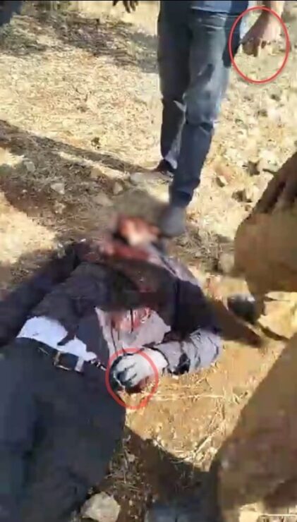 בתמונה: המחבל ההרוג עם האבן שהשליך על המשפחה עדיין בידו ומתקרב אליו מחבל נוסף עדיין עם אבן שהתכוון להשליך על המשפחה.