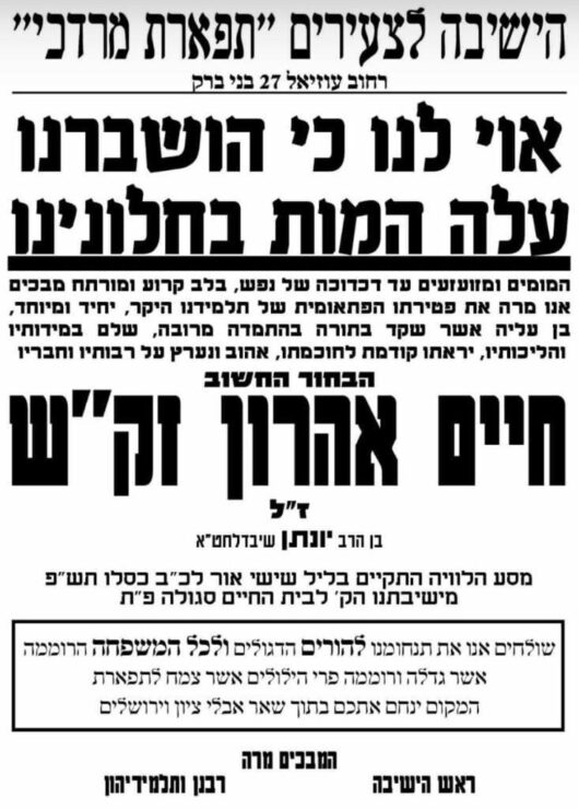 הלווייתו תצא הלילה בשעה 1:15 מישיבת היכל משה בבני ברק לבית העלמין סגולה.