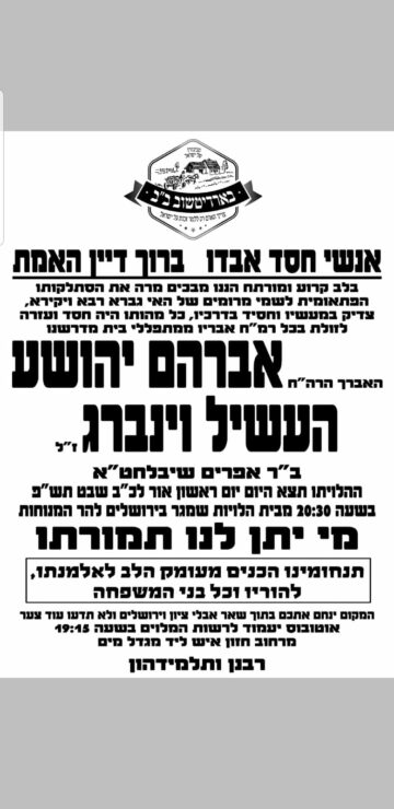שמו של ההרוג אברהם יהושע העשיל (אברמי) וינברג ז"ל בן 25 מחסידות סלונים בבני ברק, התחתן לפני כחצי שנה. ביום ראשון בשבוע הבא אמור להתקיים חתונת אחותו.