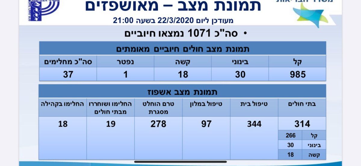 משרד הבריאות מעדכו כי מנין הנדבקים בנגיף הקורונה בישראל עלה הערב ל-1071 חולים, מתוכם 985 קל 30 בינוני ו-18 קשה, 37 החלימו ושוחררו.