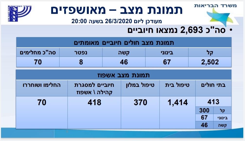 ממשרד הבריאות מעדכן כי עד לשעה 20:00, מספר הנדבקים בקורונה עומד על 2693, מהם 8 שנפטרו, 46 במצב קשה, 67 בינוני ו-70 החלימו.