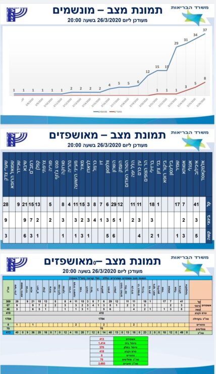 תמונת מצב מאושפזים: בבתי החולים 413, טיפול בבית 1,414, טיפול במלון 370, טרם הוחלט מסגרת האשפוז 418.