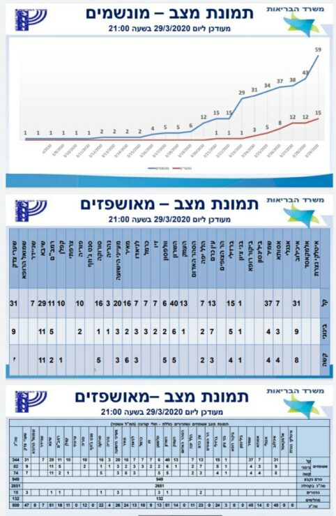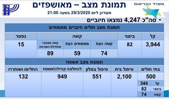 משרד הבריאות מעדכן כי מספר החולים בישראל עלה ל-4,247 בני אדם – 74 במצב קשה, מהם 59 מונשמים, 82 במצב בינוני ו-3,944 במצב קל. מניין הנפטרים עומד על 15 מתים.