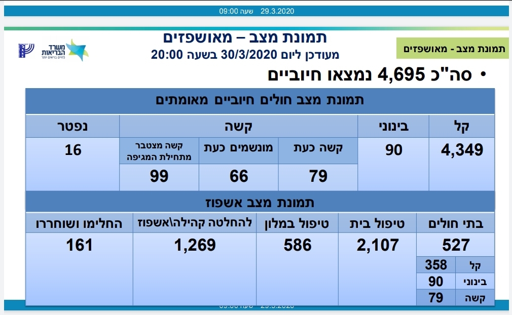 ממשרד הבריאות נמסר כי מניין הנדבקים בקורונה עלה ל-4695, מתוכם 4,349 במצב קל 90 במצב בינוני, ו – 79 במצב קשה שמתוכם 66 מונשמים, מניין הנפטרים עומד על 16 מתים.